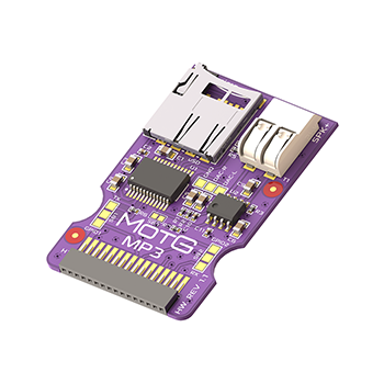 MOTG-MP3 – модуль для воспроизведения MP3-аудиофайлов, которые хранятся на карте micro-SD. MOTG-MP3 оснащен 16-битным микроконтроллером, который разработан для аппаратного декодирования звука. Данный модуль имеет встроенный монофонический усилитель для работы с динамиком 4 Ом; 3 Вт. Стереофонический выход ЦАП предназначен для подключения непосредственно к наушникам или к внешнему усилителю. MOTG-MP3 представляет собой функциональное, компактное и недорогое решение. Функции управления MOTG-MP3, такие, как PLAY, PAUSE, STOP, NEXT, PREVIOUS и VOLUME передаются от хост-микроконтроллера через интерфейсную плату.