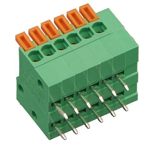 Клеммные колодки с пружинным зажимом для монтажа на печатную плату. Все колодки изготавливаются из качественных материалов - пружины из нержавеющей стали, контакты из медного сплава покрытого оловом. Полиамидный (PA66) корпус отличается высокой механической прочностью, низким влагопоглощением и классом устойчивости к воспламенению UL94-V0. Диапазон рабочей температуры изделий от -40 до 105 °С. Конструкция колодок предусматривает возможность соединения нескольких блоков для получения необходимого количества контактов.