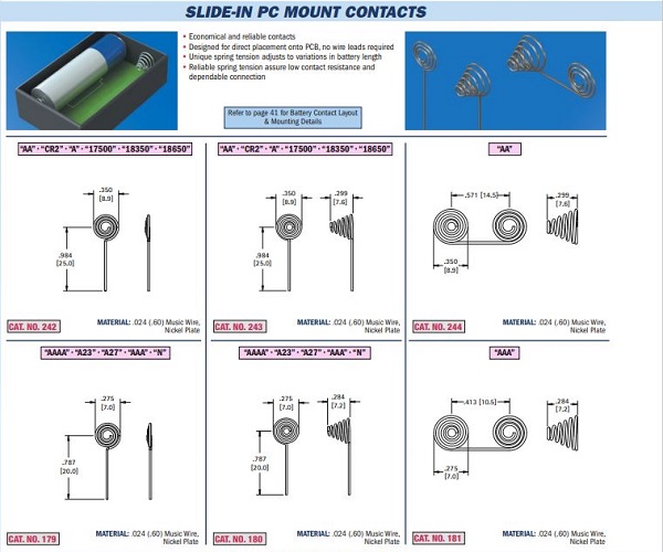 Контакт для элементов питания типоразмеров AAA, AAAA, N, A23, A27; сталь с никелевым покрытием.