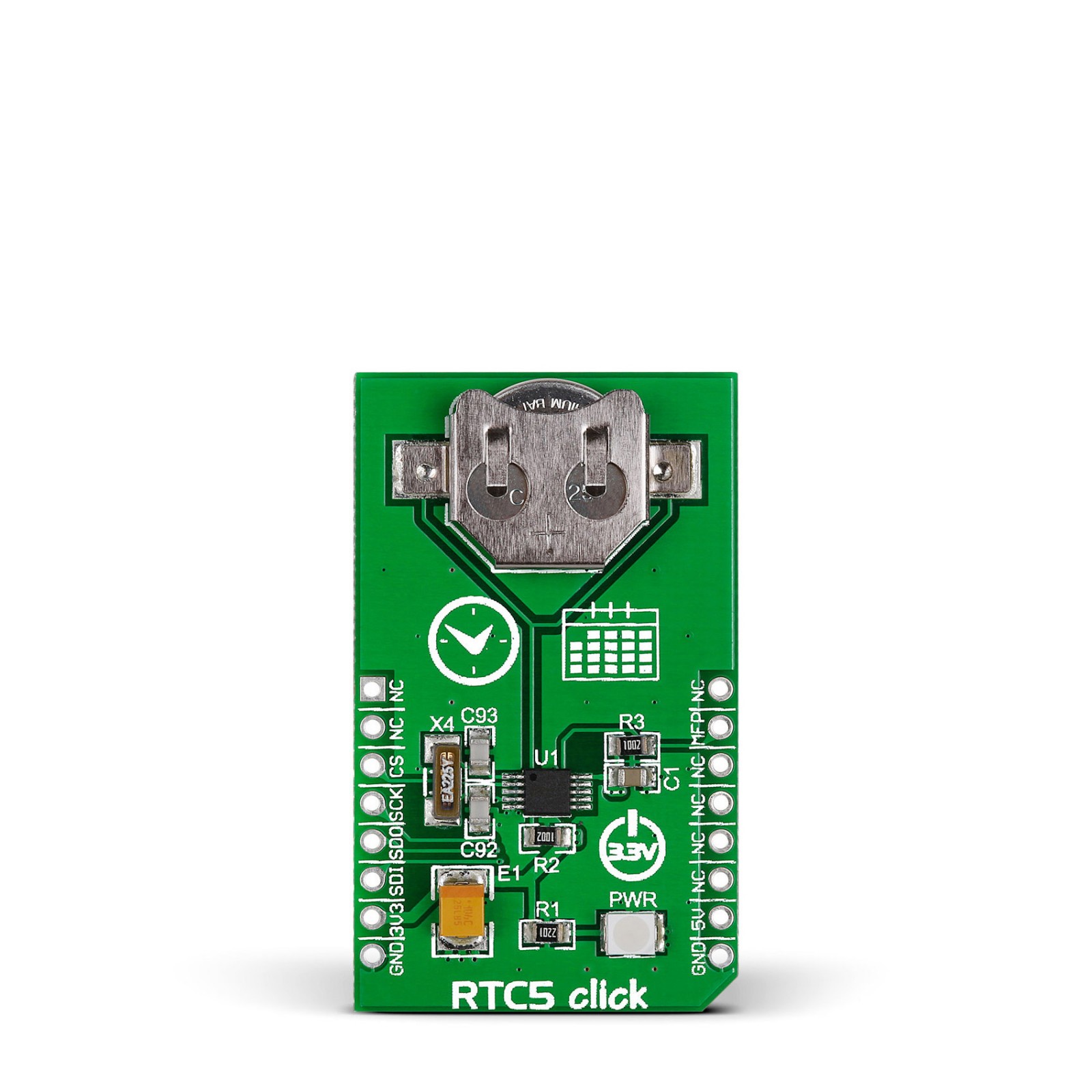 RTC5 click - это плата расширения в форм-факторе mikroBUS с часами / календарем реального времени с интерфейсом SPI MCP79510. Для резервного питания имеется держатель для литиево-полимерных батарей. Чип имеет 64-байтный SRAM с батарейным питанием и 1 Кбит EEPROM для хранения данных, а также 128 бит защищенного пространства для хранения уникального идентификатора. Часы / календарь автоматически компенсируют високосные годы и месяцы короче 31 дня. Плата предназначена для использования только с источником питания 3.3 В.