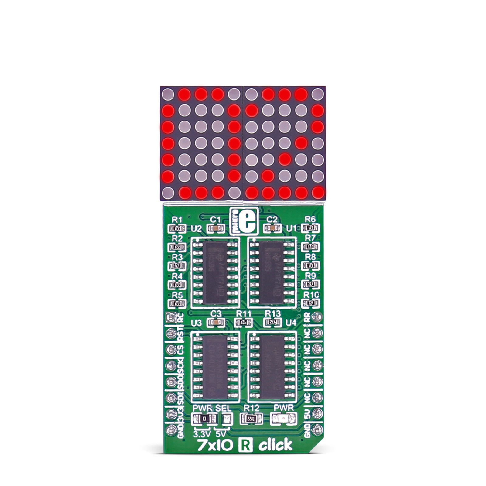 7x10 R click - это плата расширения в форм-факторе mikroBUS со светодиодной матрицей, которую можно использовать для отображения графики или букв. На плате есть два светодиодных матричных модуля 7x5 с круглыми, точечными светодиодными элементами красного цвета. Интерфейс GPIO, SPI; питание 3.3 В или 5 В