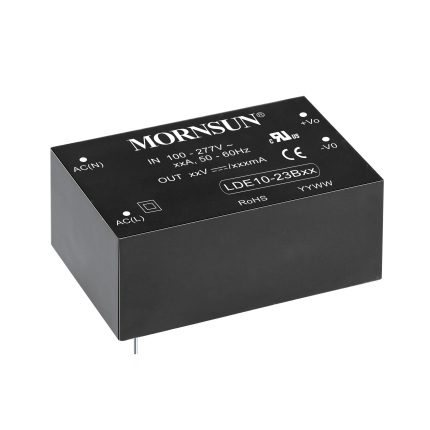 Компактный AC-DC преобразователь серии LDE10-23B на выходную мощность 10 Вт; 12 В; 900 мА; широкий диапазон входного напряжения высокая удельная мощность, высокая эффективность; соответствует стандартам IEC/EN/UL62368; монтаж на печатную плату.