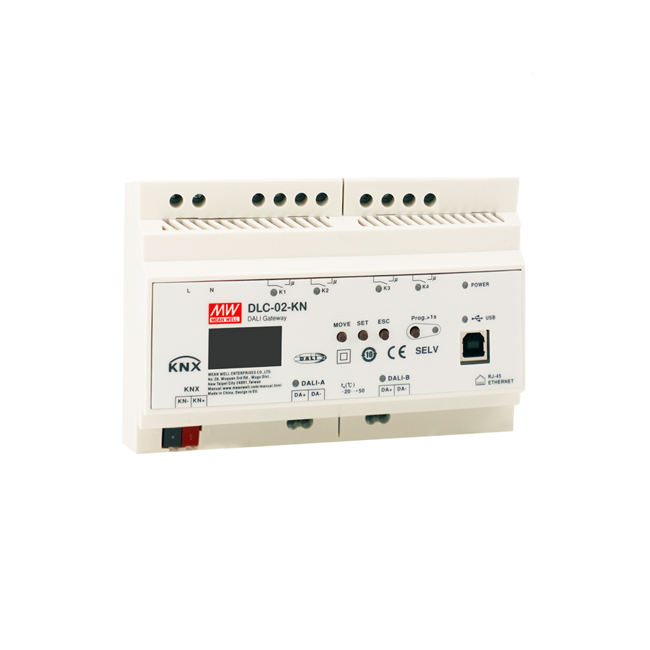 Цифровой контроллер DLC-02 имеет два канала управления устройствами по шине DALI-2. По каждому каналу возможно подключение до 64 устройств (светодиодные источники питания с интерфейсом DALI, датчики, переключатели и пр.). Данное устройство имеет встроенный источник питания, обеспечивающий выходное напряжение 16 В и ток до 250 мА для шины DALI-2. Кроме того контроллер имеет встроенное реле, обеспечивающее возможность работы с электрическими устройствами, например, для открытия/закрытия штор.