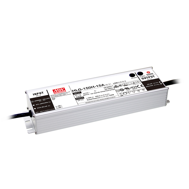 Источник питания для светодиодных светильников наружного применения - семейство HLG-H. Мощность 150 Вт; 12 В; 12.5 A; встроенный ККМ; стабилизация по напряжению и току; IP65; металлический корпус; встроенные потенциометры.