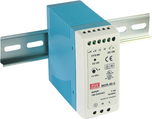 Сетевые источники питания на DIN-рейку серии MDR-40. Узкий корпус - полезен в тех случаях, когда требуется запитать одновременно и независимо много малопотребляющих устройств (например, промышленных датчиков).