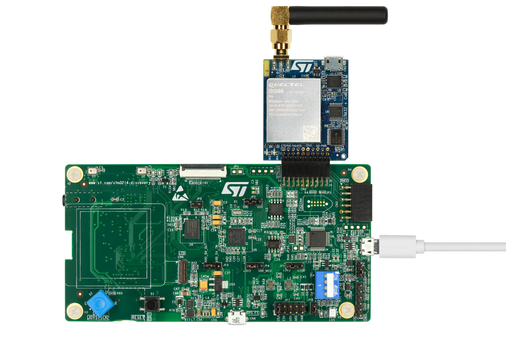 Демонстрационная плата с STM32L496AG для подключения устройств IoT к облачным сервисам по сетям 2G/3G или LTE Cat M1/NB1. Комплект состоит из материнской платы с низким энергопотреблением на базе STM32L496AGI6 с предустановленной прошивкой и платы расширения STMod+ с антенной.