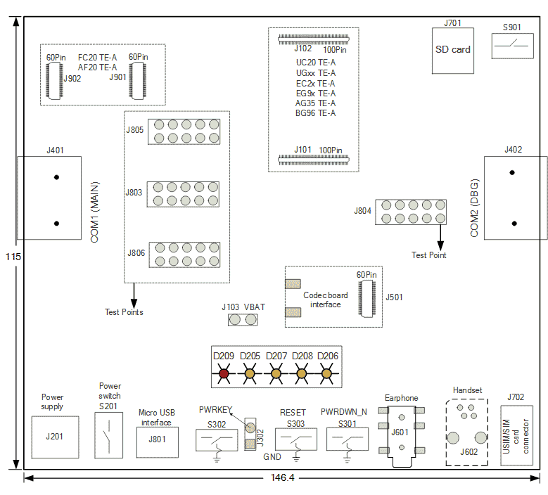 - Выключатель питания (S201), PWRKEY (S302) для вкл./выкл. модулей, СБРОС (S303), PWRDWN_N (S301), Выключатель Функции BT (S901),