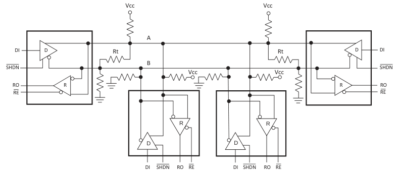 На рис. 2. показано применение резисторов, подтягивающих линии A и B к питанию и общей цепи. Помимо исключения неопределенности состояний, эти резисторы необходимы для корректной работы автоматического режима направления данных. Он включается высоким уровнем на выводе RE. Низкий уровень принудительно включает режим приема.