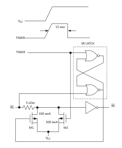 При установке плат в работающее устройство различные помехи, паразитные емкости цепей, первоначальное нахождение выходов не начавшего работу микроконтроллера в высокоимпедансном состоянии и токи утечек могут спровоцировать появление на входах RE и DI неверных логических сигналов. Для предотвращения этого MAX13487 использует специальную схему, показанную на рис. 3., которая задерживает на входах RE и DI изменение состояний на 15 мкс с момента подачи питания. При падении напряжения питания до 1 В схема возвращается в исходное состояние.