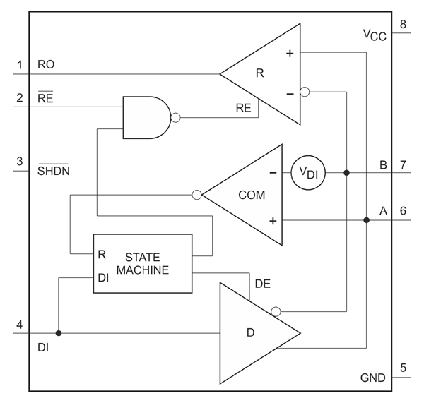 Классический трансивер этого интерфейса для переключения между режимами приема или передачи информации имеет сигналы управления приемной и передающей частями, что требует выделения дополнительно как минимум одного вывода микроконтроллера. MAX13487 предоставляет функцию автоматического переключения режимов приема-передачи. Освободившийся вывод корпуса трансивера (№3 на рис. 1.) используется для управления спящим режимом, что может быть актуальным для устройств с автономным питанием. Кроме того, упрощается гальваническая изоляция трансивера: требуются всего два оптрона или минимальный цифровой изолятор с двумя разнонаправленными линиями.