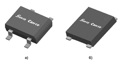 Рис. 1. Внешний вид и устройство диодных мостов DF10S (а) и YBS3010 (б)