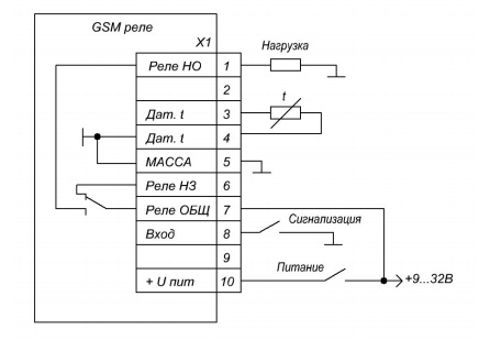 Устройство имеет вход для шлейфовой сигнализации. При срабатывании сигнализации отправляется SMS и звонок на запрограммированные номера. При звонке на номер SIM-карты GSM реле, в ответ приходит сообщение с данными о состоянии модуля и шлейфа охраны, времени таймера, температуры, температурного порога, напряжения питания и состояние баланса. Управление отдельными функциями производится с помощью шаблонов SMS-команд. Типовая схема включения реле изображена на рис.1.