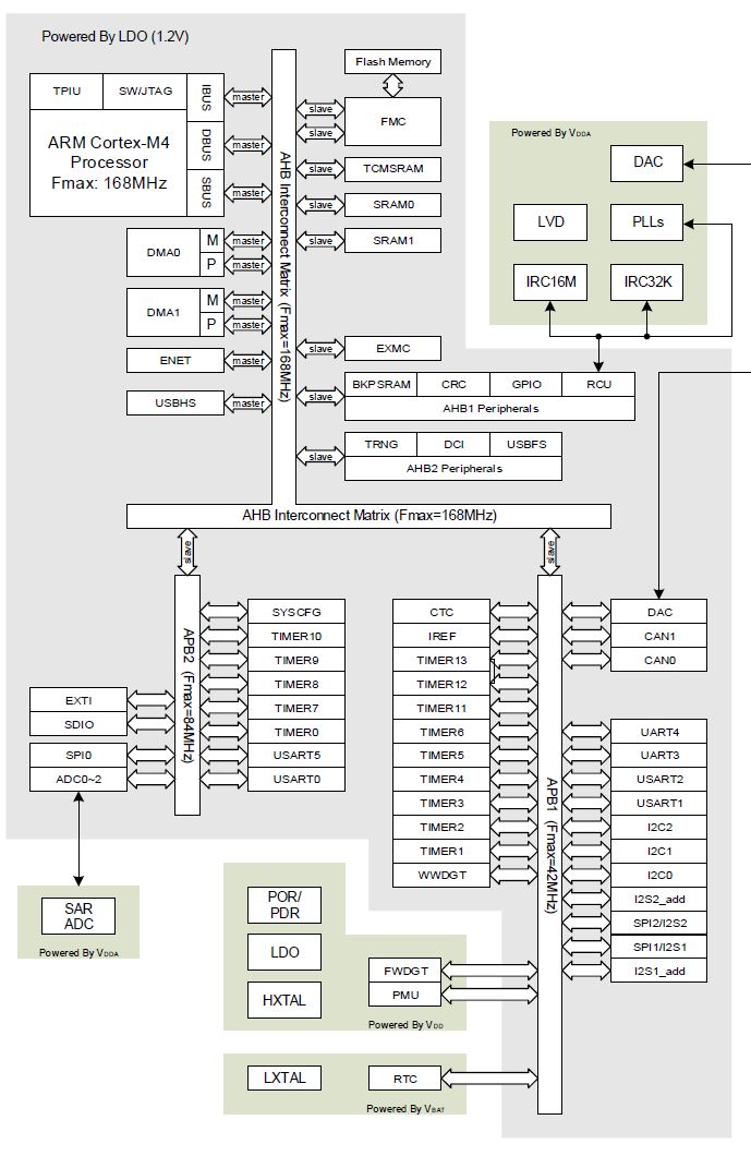 - Тактовые генераторы: HXTAL, LXTAL, IRC32K, IRC16M, IRC48M;
