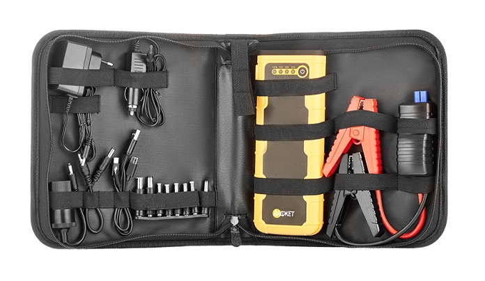 Пуско-зарядное устройство Автостарт PRO поможет не только завести автомобиль с разряженным аккумулятором, но и зарядить внезапно отказавшиеся работать смартфоны, ноутбуки и другую электронную технику с автономным питанием. Емкость встроенного литий-ионного аккумулятора 15 Ач позволяет запустить двигатель объёмом до 7 литров при номинальном пусковом токе 300 А. Кроме того, имеются два 5 В USB-выхода для зарядки гаджетов, выход 12 В/10 А для подключения автомобильных устройств и 19 В/3.5 А для питания ноутбука. Зарядить Автостарт PRO можно двумя способами: от сетевого адаптера или от гнезда прикуривателя автомобиля. Вдобавок ко всему, имеется встроенный фонарь, который может работать в непрерывном режиме, мигающем для обозначения аварийной остановки, или в режиме SOS. В комплект устройства входят необходимые кабели и переходники, которые вместе с основным устройством можно убрать в удобную папку-органайзер (рис. 1).