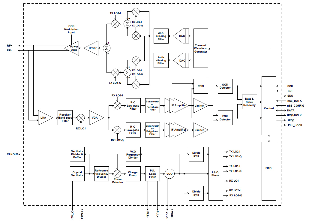 - программируемая скорость передачи данных: 32 kbps (OOK), 200 kbps(FSK);