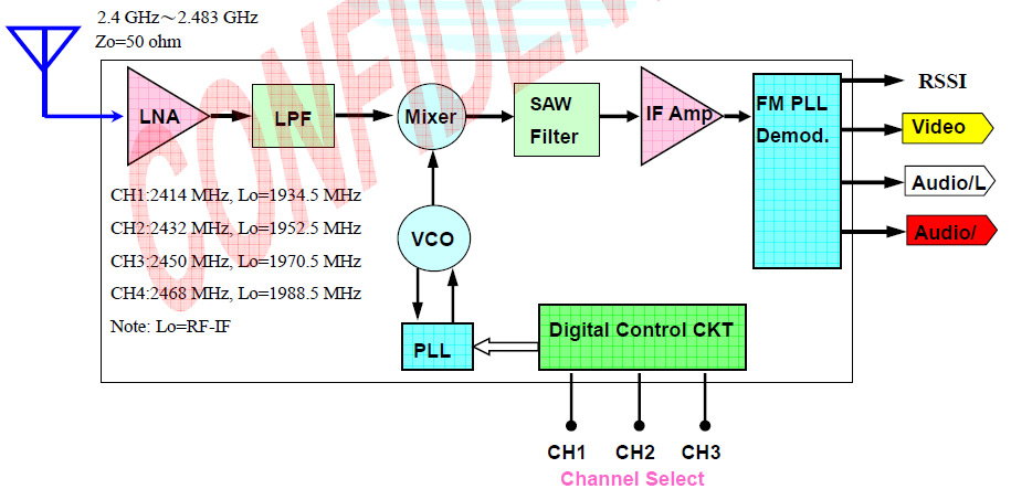 РЧ приемный модуль полностью удовлетворяет стандартам FCC и R&TTE, что гарантирует прием широкополосного аудио- и видео- сигналов на расстояние до 100 метров на открытой местности.