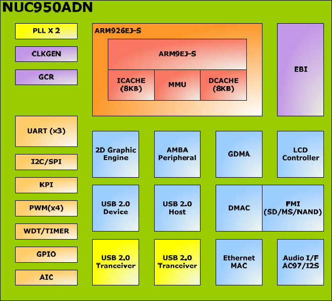- интерфейс Flash-памяти (FMI), с поддержкой SD/ММС/SDIO/Memory Stick/Memory stick PRO/NAND flash, DMA и 2 буфкрами по 512 Байт;