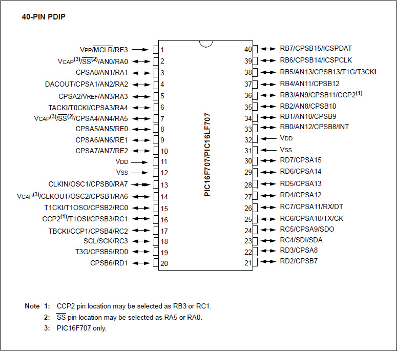 PIC16F707 совместим по выводам с микроконтроллерами PIC16CXXX и PIC16FXXX.