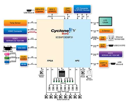 SoC содержит основанный на ARM ядре аппаратный процессорный блок (HPS), включающий в себя процессор, периферию и интерфейс памяти, соединенные с ПЛИС широкополосными соединительными магистралями. Плата SoCKit - the Development Kit for New SoC Device имеет богатый набор периферии, включая высокоскоростную DDR3 память, видео и аудио интерфейсы, Ethernet и др. На плате также располагается разъем HSMC, подключенный к высокоскоростным трансиверам, позволяющий использовать внешние платы расширения. Используя все перечисленные выше возможности, SoCKit - the Development Kit for New SoC Device является идеальным решением для демонстрации возможностей, оценки и создания прототипов на базе высокопроизводительных систем-на-кристалле Altera.