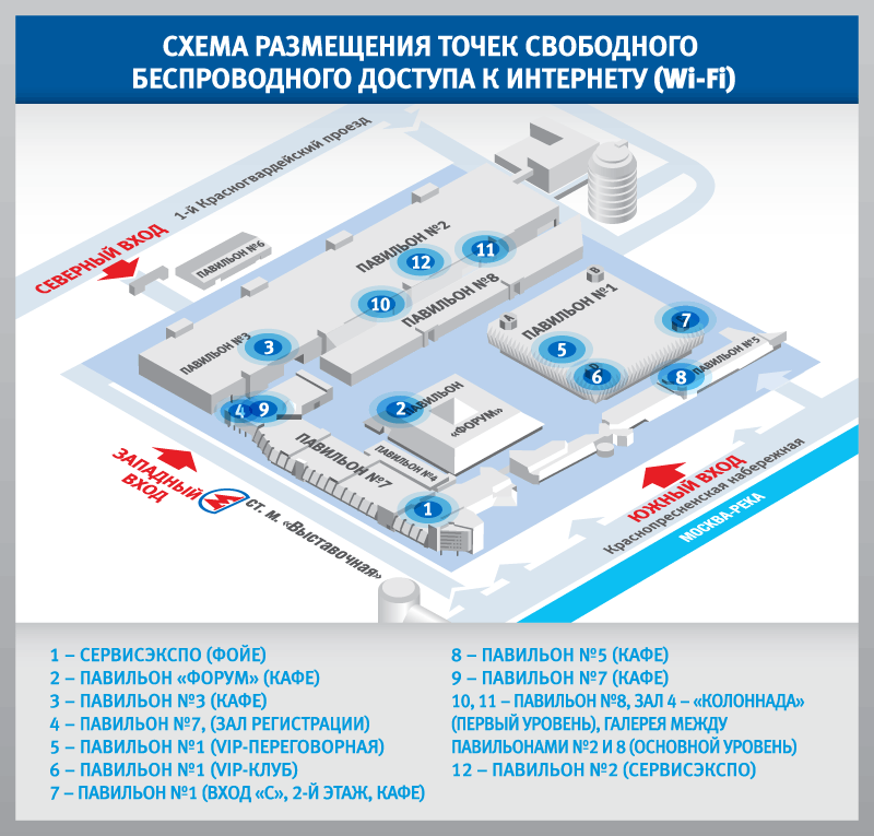 «Экспоцентр» предоставляет свободный беспроводной доступ к сети Интернет в специально выделенных зонах WiFi. С размещением зон на территории ЦВК можно ознакомиться на плане комплекса.